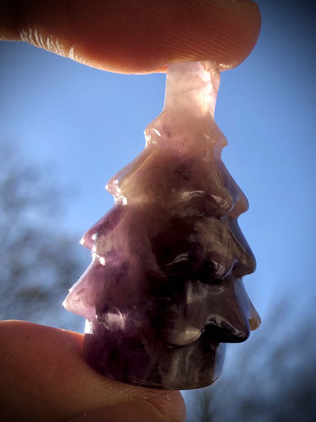 Every Amethyst Mini Christmas Tree carving measures 4 cm and comes in different shades of purple with white banding. Since each Tree is hand-carved, slight imperfections may be present. Each carving is elegantly packaged in a velvet pouch, accompanied by an information card and cleansing instructions for Amethyst.