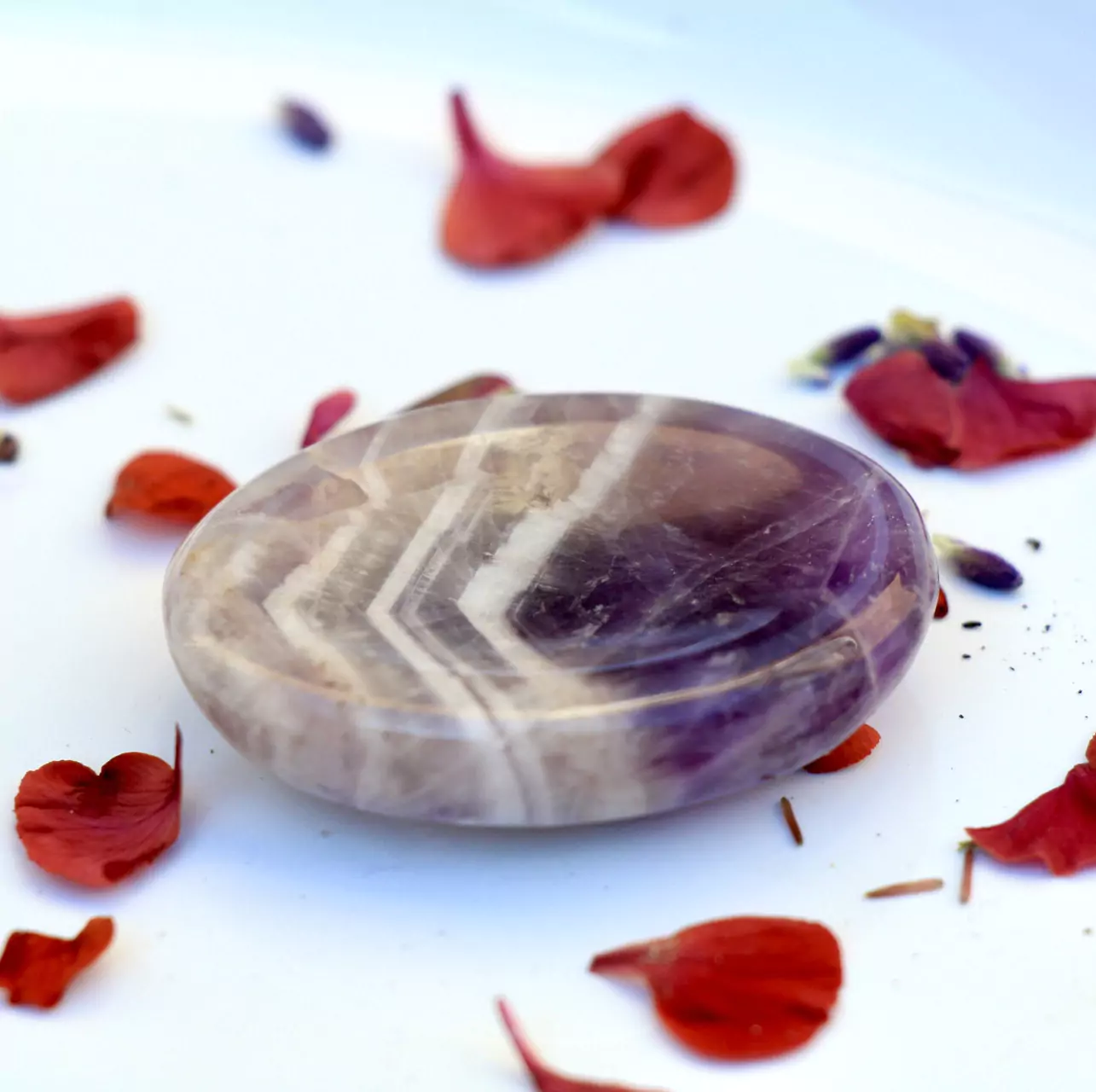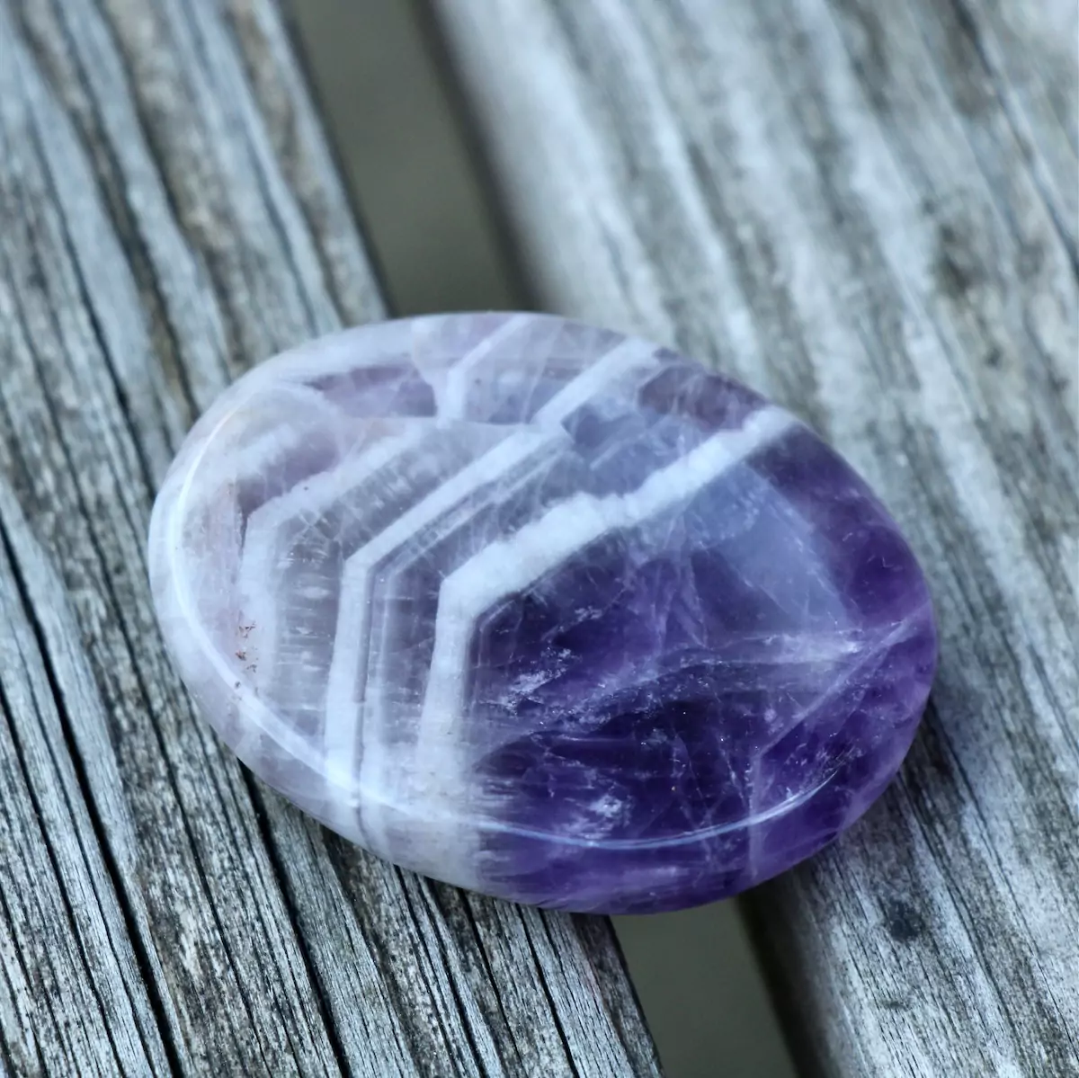 Each Chevron Amethyst worry stone is 1.5-2” and is unique in appearance ranging from ones which are dark purple to some which are light purple/grey. Chevron Amethyst differs from normal Amethyst as it has white V shaped banding throughout. The white banding is made of Quartz. Each worry stone comes beautifully packed with an information card outlining its benefits as well as cleansing instructions.