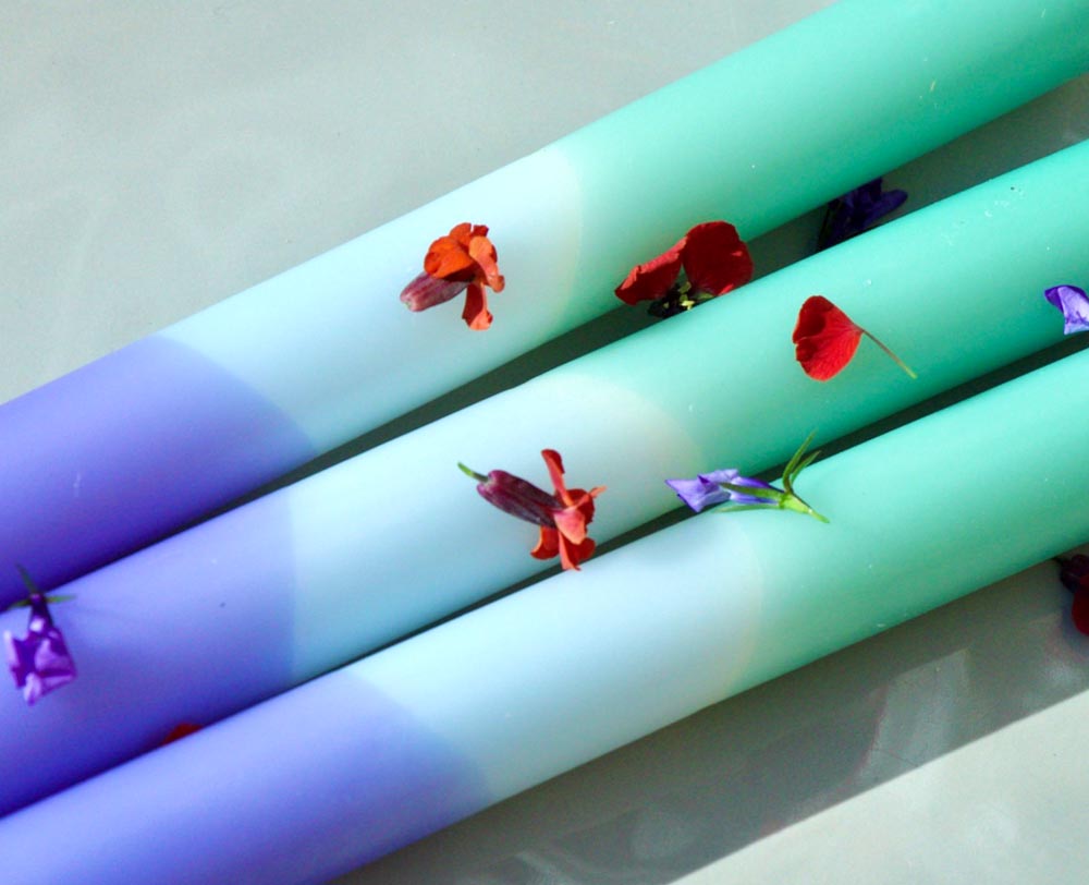 Add a splash of colour to your dining experience this summer with our delightful trio of dip-dyed dinner candles! Perfect for both indoor and outdoor settings, these unique candles are hand-dipped in the Surrey Hills, England, ensuring that each set has its own distinctive pattern while maintaining the same vibrant colour combination.